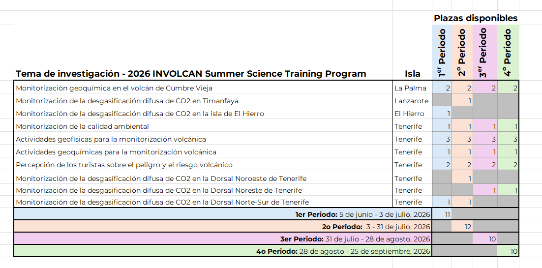 Únete al 2026 INVOLCAN Summer Science Training Program y participa en una experiencia única de investigación de 4 semanas en las Islas Canarias. Las personas participantes trabajarán codo con codo con personal investigador del Instituto Volcanológico de Canarias (INVOLCAN) y del Instituto Tecnológico y de Energías Renovables (ITER), adquiriendo experiencia práctica en áreas como la vigilancia volcánica y ambiental, y las ciencias sociales aplicadas a la volcanología.