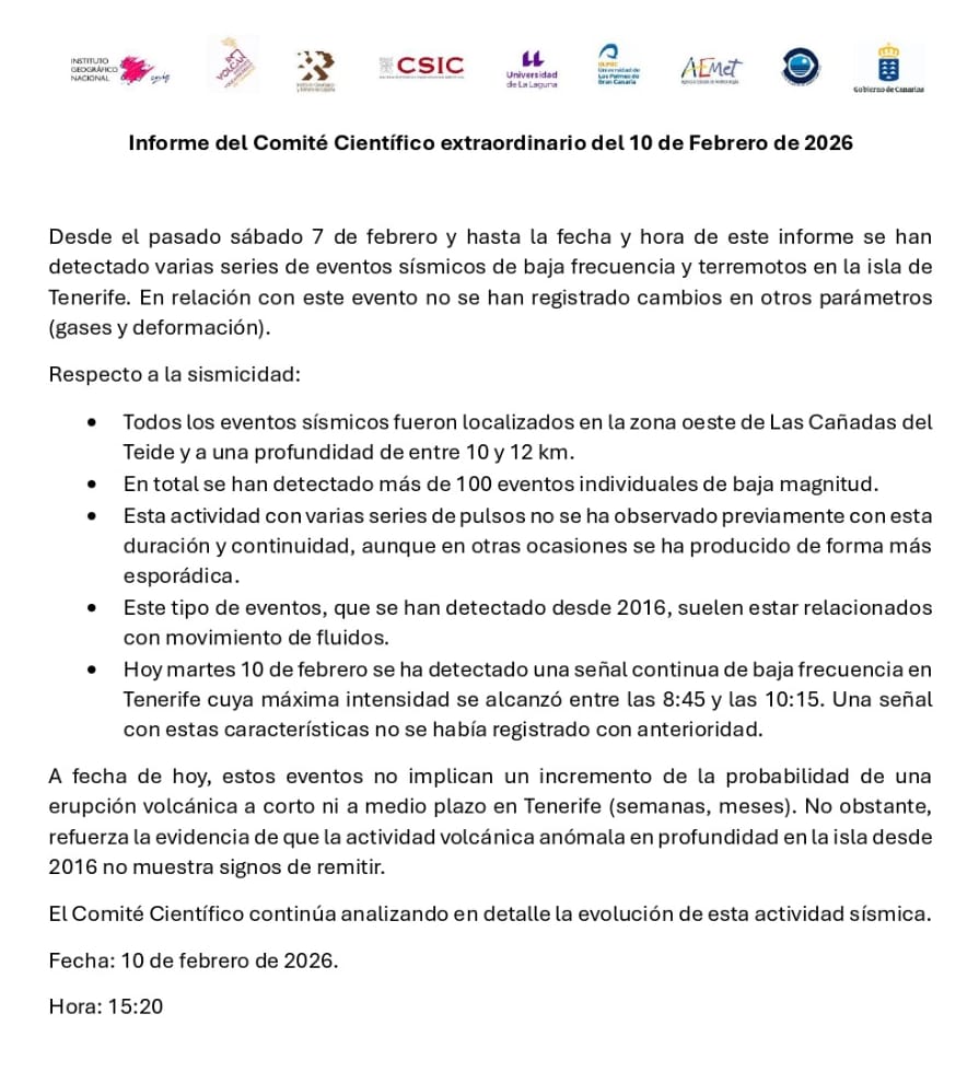 Desde el pasado sábado 7 de febrero y hasta la fecha y hora de este informe se han detectado varias series de eventos sísmicos de baja frecuencia y terremotos en la isla de Tenerife. En relación con este evento no se han registrado cambios en otros parámetros (gases y deformación).